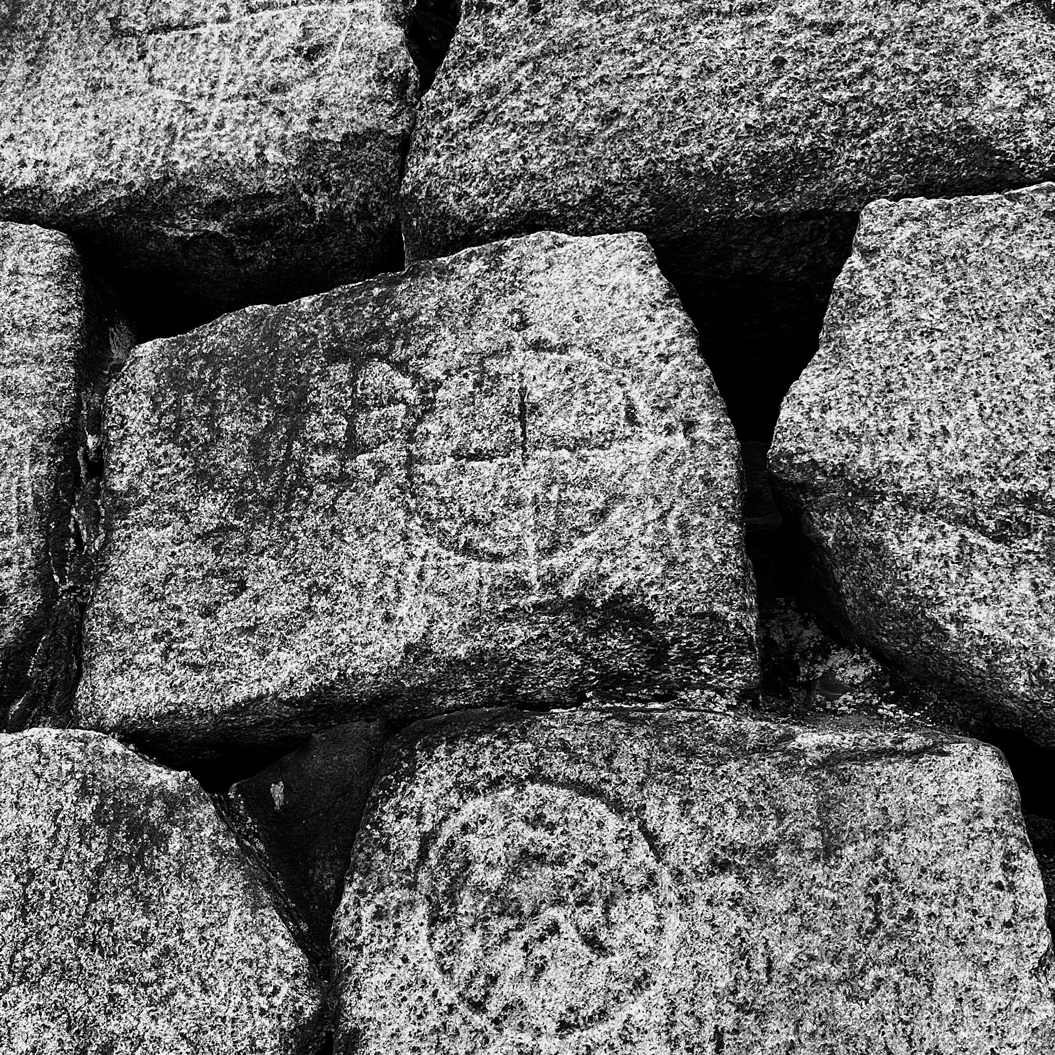 Survey/boundary markings: While checking out Osaka Castle, I made it a point (after seeing a placard and note inside the castle) to find some of the rock carvings on a small portion of one of the walls: